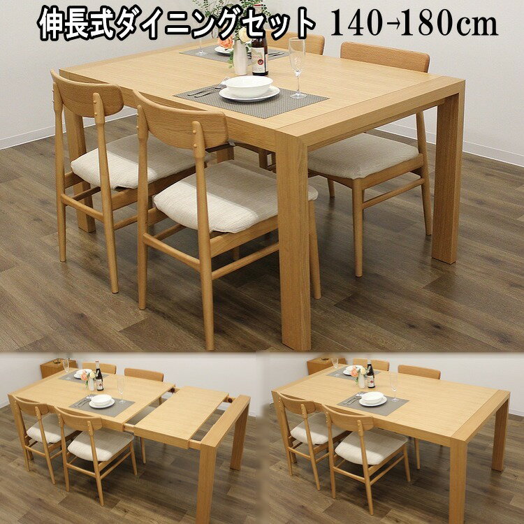 伸長式ダイニング5点セット ダイニングテーブルセット 北欧スタイル ナチュラルシンプルモダン オーク材 カバーリング式チェア 140cm〜180cm幅