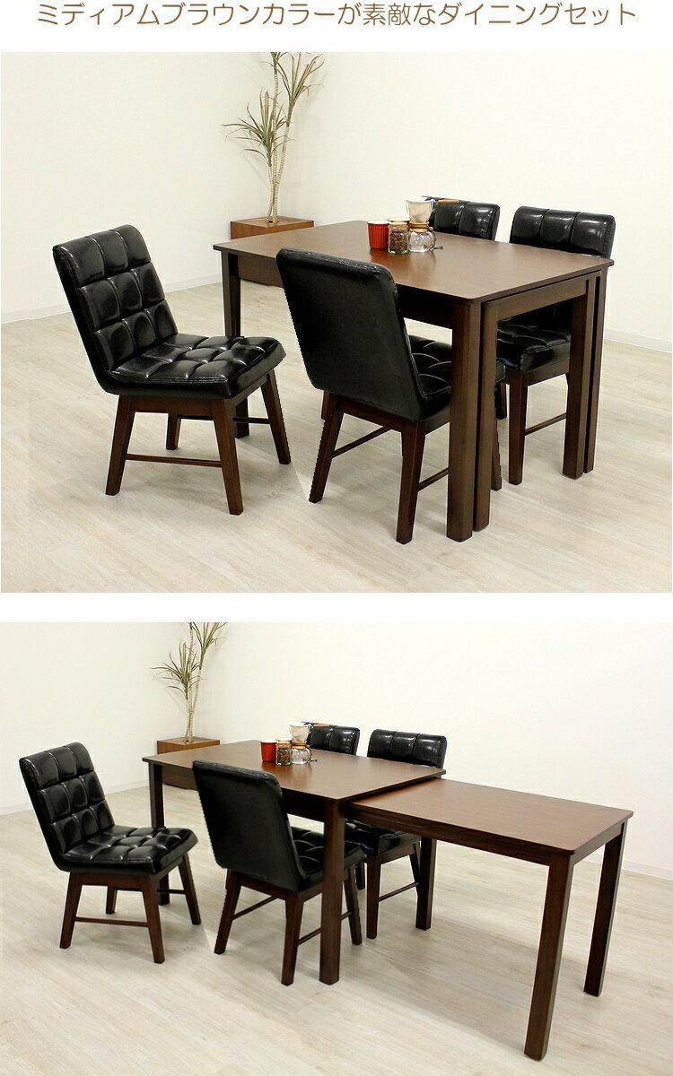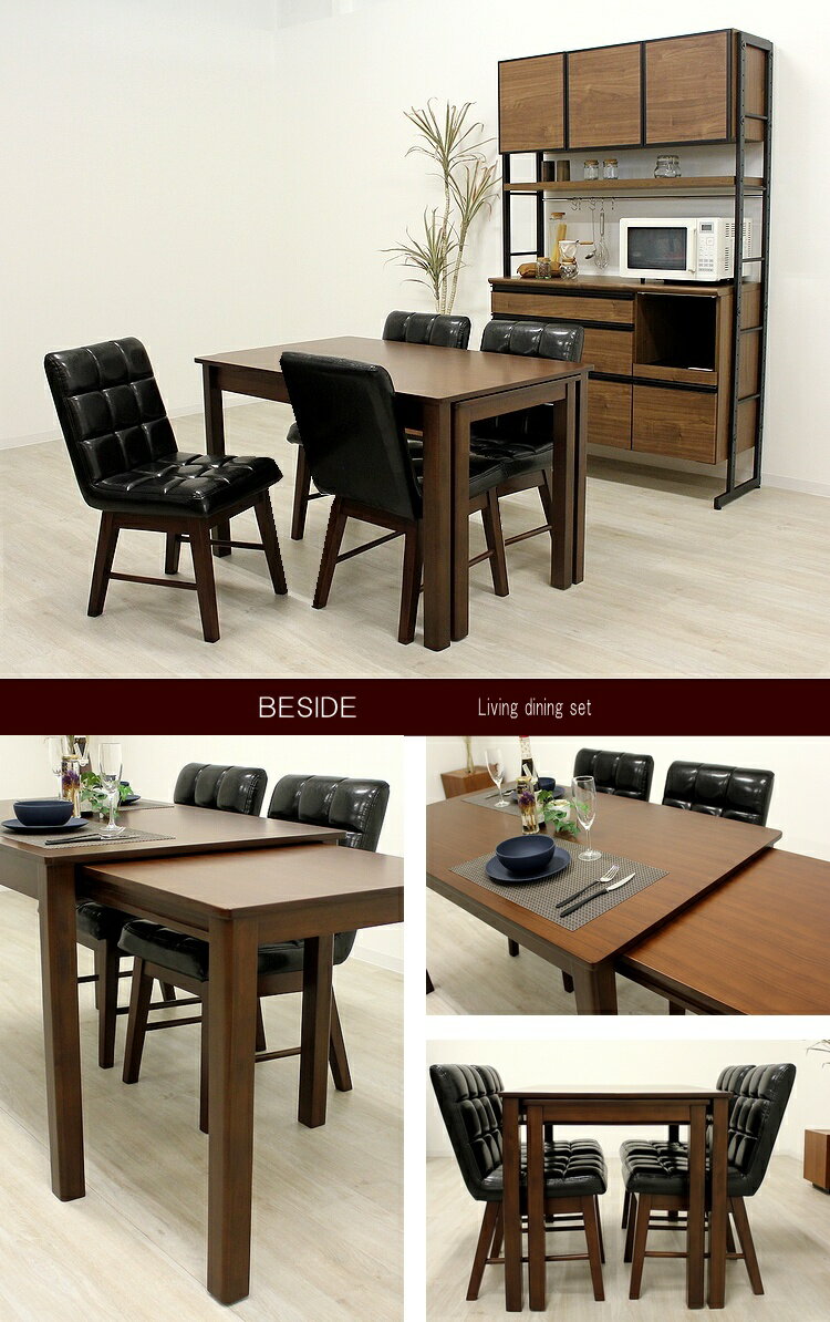 シリーズBESIDE 商品名 ダイニング5点セット 商品説明 ●テーブルが伸縮する便利なダイニングセット、人数が増えても機能的に変身します ●天板はウォールナット材の突板で、仕上げも美しく高級感もたっぷり ●インナーキャスターで簡単に伸長できるテーブル 必要な分だけ伸ばせて場所も取りません。