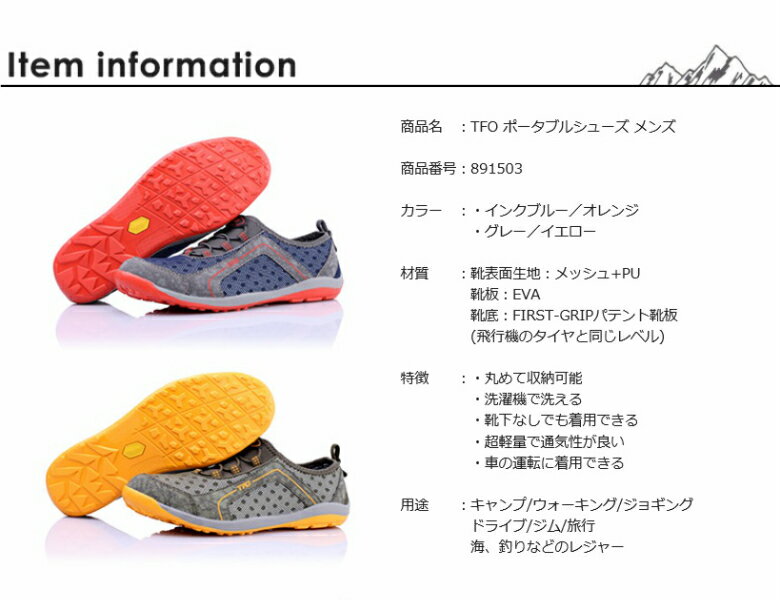 商品名 :TFO ポータブルシューズ メンズ 商品番号:891503 カラー :・インクブルー/オレンジ ・グレー/イエロー 材質 :靴表面生地:メッシュ+PU 靴板:EVA 靴底:FIRST-GRIPパテント靴板 (飛行機のタイヤと同じレベル) 特徴 :・丸めて収納可能 ・洗濯機で洗える ・靴下なしでも着用できる ・超軽量で通気性が良い ・車の運転に着用できる 用途 :キャンプ/ウォーキング/ジョギング ドライブ/ジム/旅行 海、釣りなどのレジャー 旅行 フィットネス ドライブ 登山 ●商品寸法(製品規格サイズ) ★