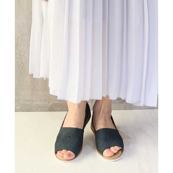 【サイズ詳細】 計測サイズ:Mサイズ(23.5cm相当) ワイズ:約22.0cm ヒール:約2.5cm 重さ:約190g 甲材:合成繊維 【商品仕様】 ムラ染めで自然素材のような味わいがある、合皮フラットサンダルです。